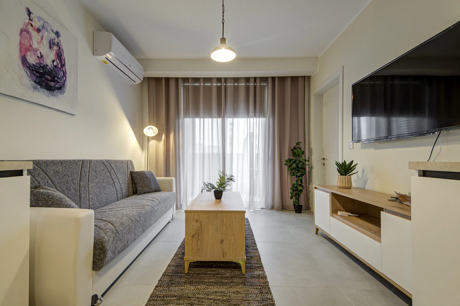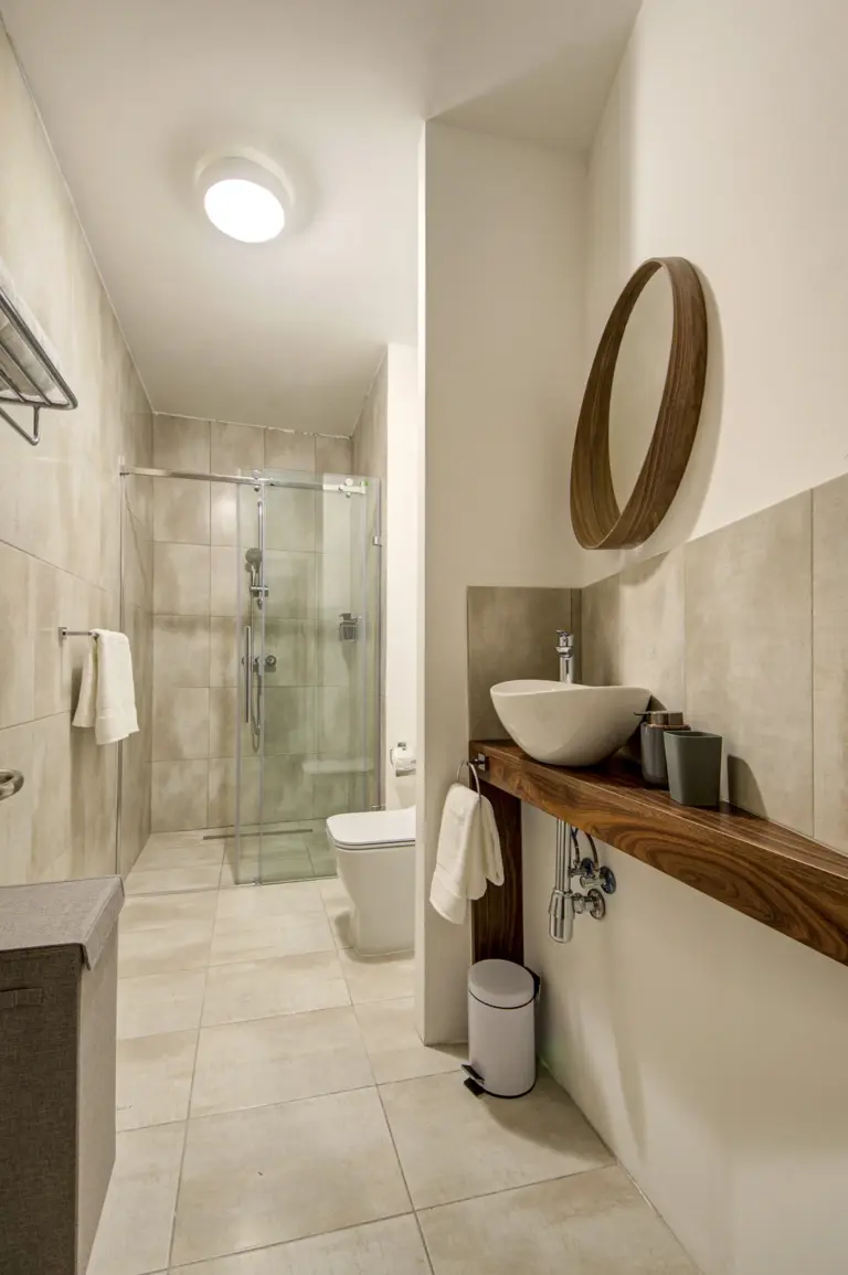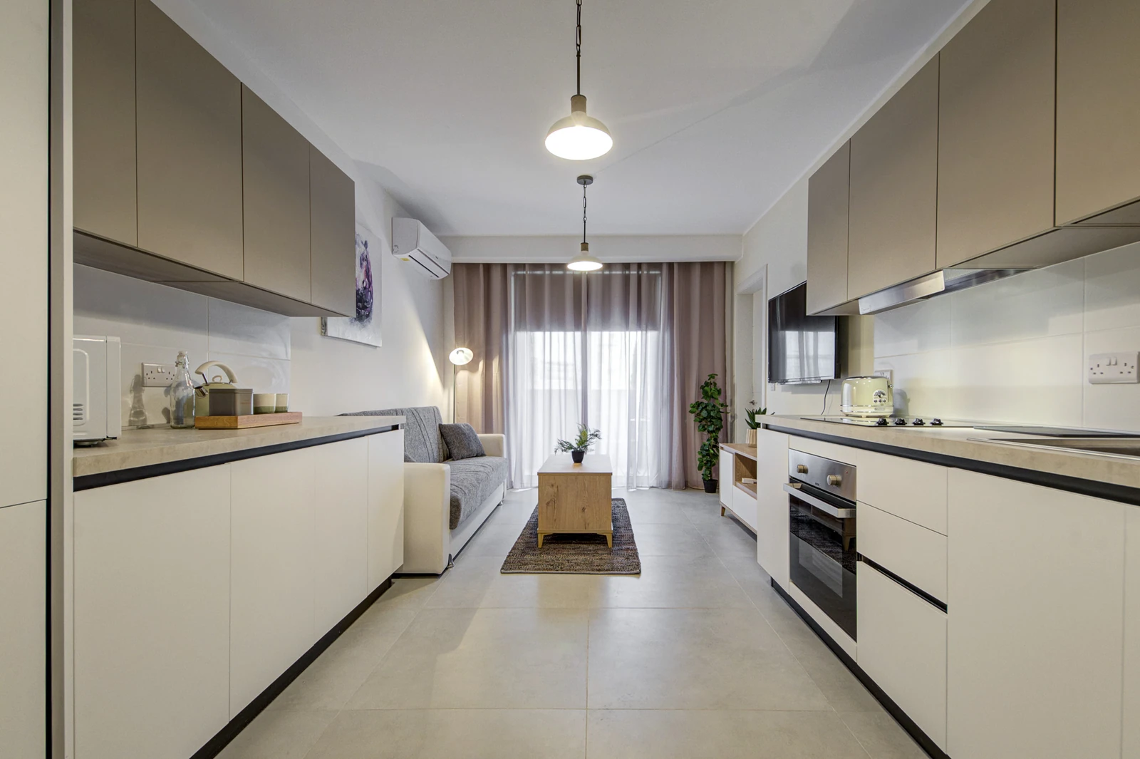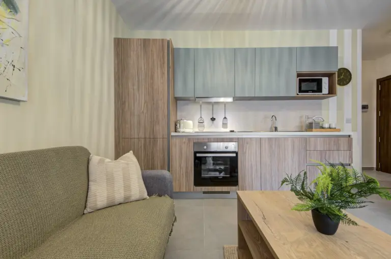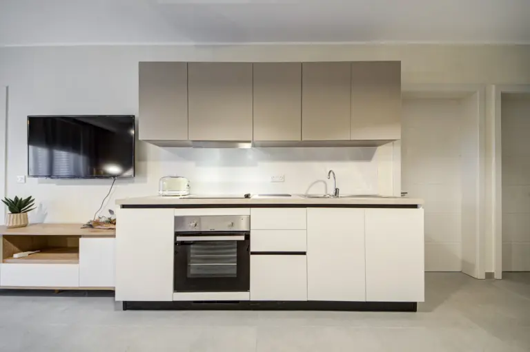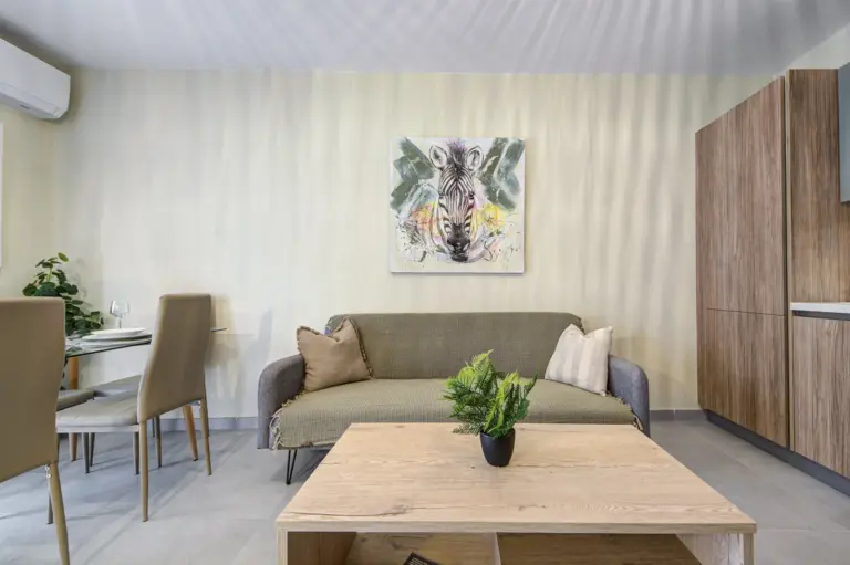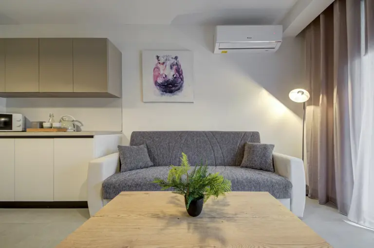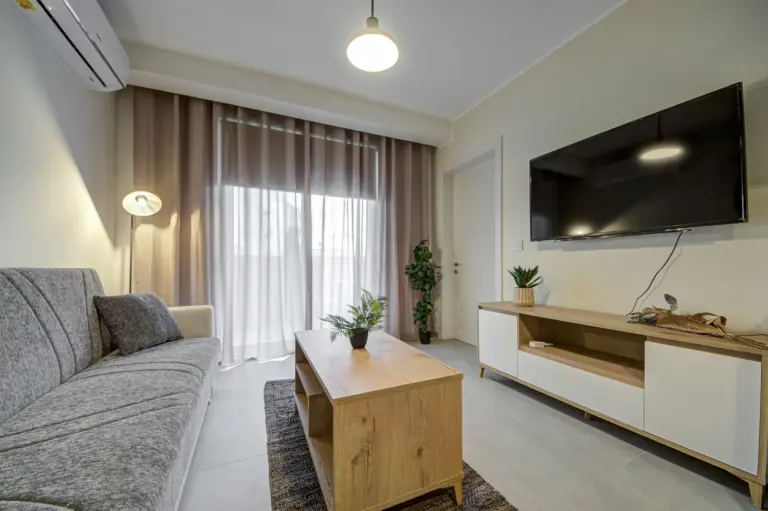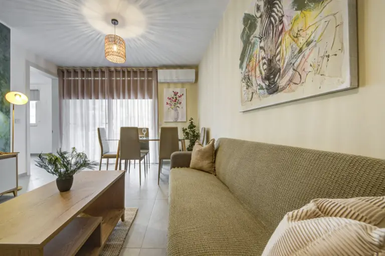 Apartments range from 55 to 85 sqm and include open-plan layouts, private balconies or terraces, lift access, air-conditioned living areas, and secure intercom entry. Most units offer en-suite and guest bathrooms. Finished to high standards, each home features modern tile flooring, built-in kitchen appliances, double-glazed windows, and energy-efficient lighting, all wrapped in a clean, neutral aesthetic tailored for comfortable, long-term living.
